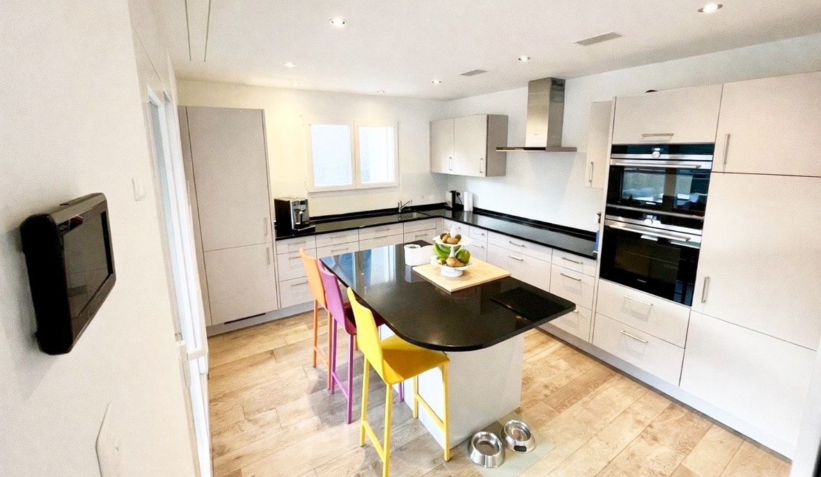 Der offen konzipierte Wohn- und Essbereich mit moderner Küche inklusive Kochinsel, schwarzer Granit-Arbeitsplatte und hochwertigen Einbaugeräten bildet das Herzstück der Wohnung. Der grosszügige Balkon bietet Platz zum Entspannen und eine schöne Aussicht auf die umliegende Berglandschaft.